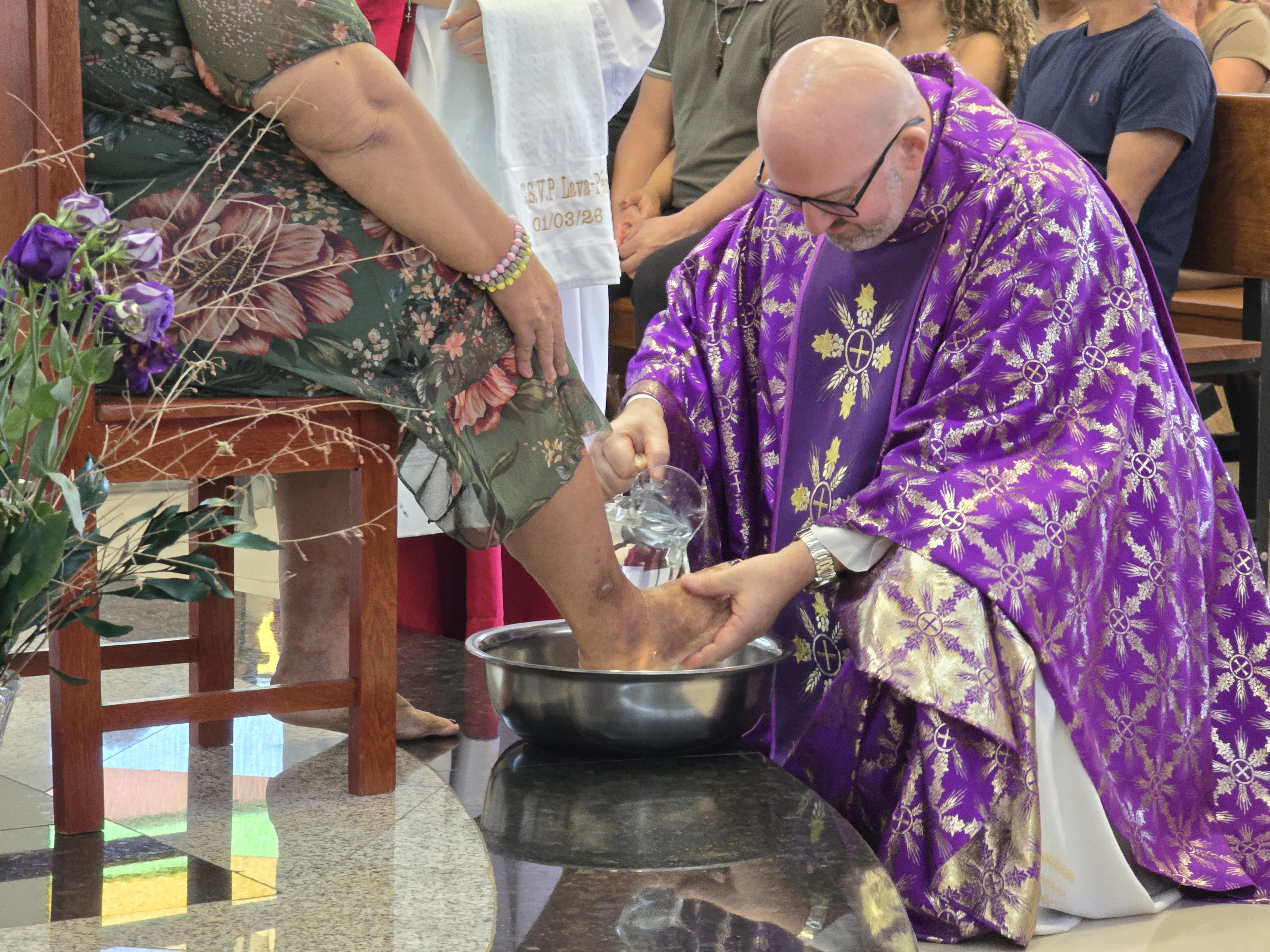 Após o rito da comunhão, Padre Valdecir colocou-se na condição de servidor ao lavar os pés de dois comunitários, recordando Cristo, que veio para servir e não para ser servido. O gesto sintetizou o espírito com o qual o sacerdote deseja iniciar sua caminhada: proximidade, humildade e serviço.