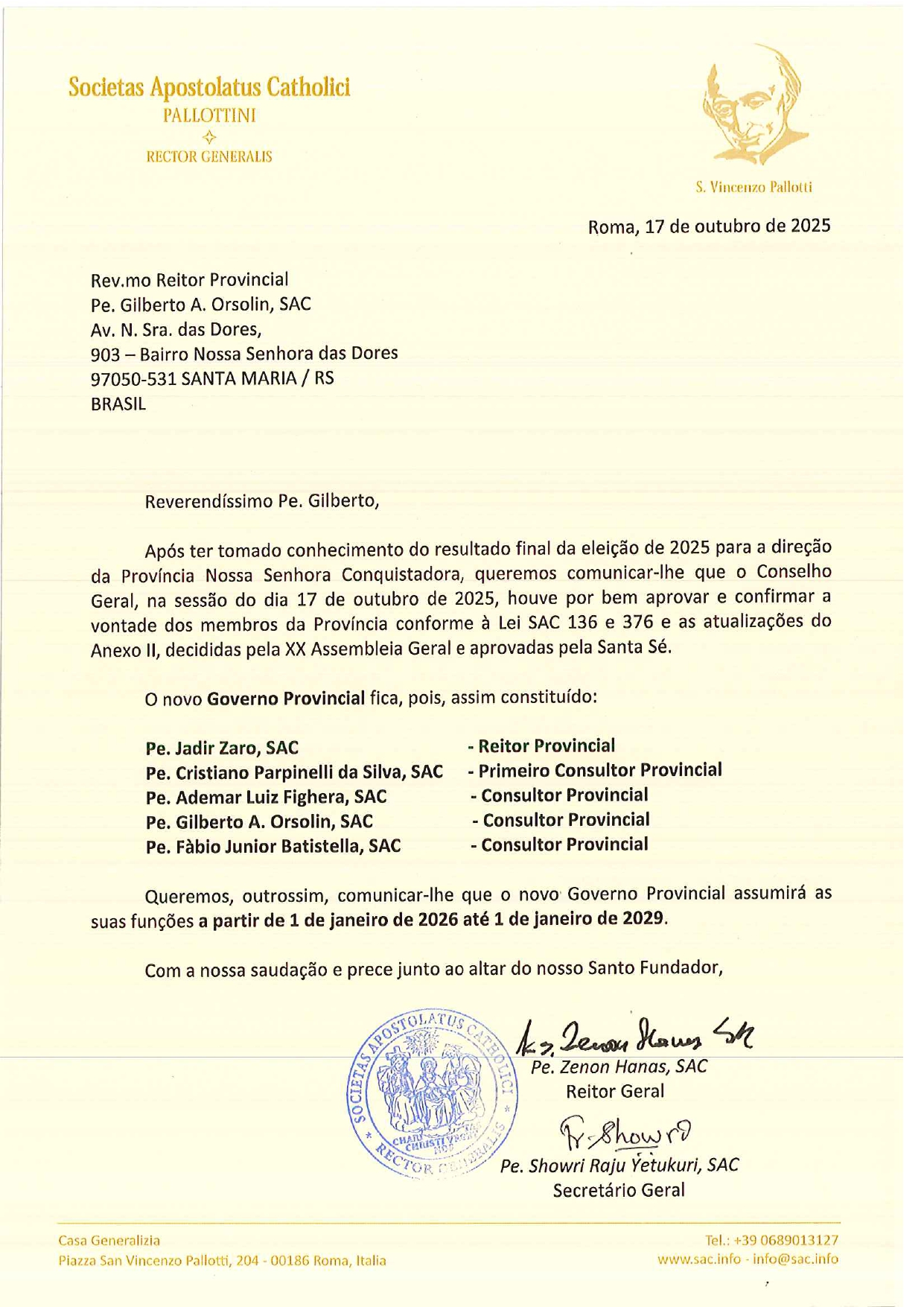O Conselho Geral acolheu e divulgou o Decreto de Nomeação do novo Conselho Provincial de Santa Maria, para o triênio 2026–2028.